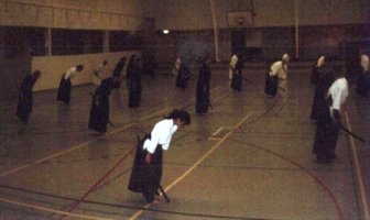 While standing with the sword it points 45 degrees down and 45 degrees to the right, not 30 degrees down as was said earlier. The kashira is on the centerline of the body. While transferring the sword to the right hand, it should be in front of you, parallel to the shoulders, pointing 30 degrees down, the ha pointing towards you. So don't bring it over to the right side before taking it into the right hand. Bow 30 degrees. The left hand is at your side during this bow, not in front of the leg. When you bring back the sword, the ha faces away from the body.