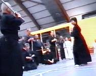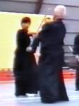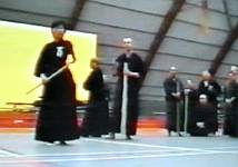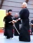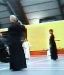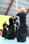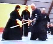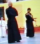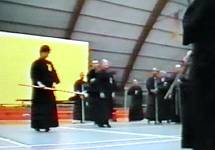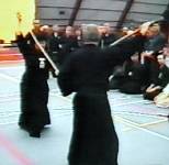 MIDAREDOME Gyakute uchi is used to strike at the bokuto held in seigan no kamae. This is followed by another gyakute uchi to the face, rotate the jo 180° and strike the bokuto down with honte uchi. A cut to shomen is countered with Maki otoshi, and a second cut is met with Taiatari followed bij hikiotoshi uchi. The push in taiatari is done with the left foot instead of the usual right foot.