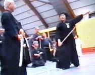 HISSAGE Hidden jo, an attack to the center of the head is evaded by moving the body to the rear, quickly followed by kuritsuke, a thrust to the enemy's suigetsu and finally a Hikiotoshi uchi to his face.