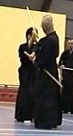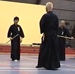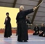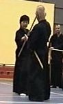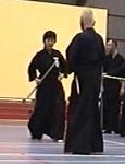 SUI GETSU To meet a sword attack to the centre of the head, the body is moved forward to the diagonal right and a thrust is made to the enemy's solar plexus. This is followed by a Hikiotosch uchi.