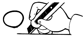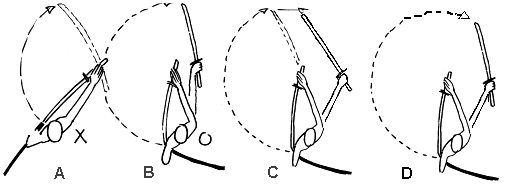 The figure marked C shows my previous understanding of nukitsuke (the second step is drawn exaggerated). In this nukitsuke you can actually cut (with the sword at a cutting rather than chopping angle) using the muscles of the back rather than relying on wrist flicks, and cutting with the monouchi instead of just the kissaki. It also keeps the wrist straighter, which is a stronger position, probably more healthy, and it conforms better to the rules of shodo (sword and brush being one), not to mention tennis. In my opinion, this extremely bent wrist thing is one of those points that will be gone or changed by next year. Also, more often than not the bent wrist nukitsuke seemed to end as in figure D, thereby losing control over the opponent. Presumably the weak wrist position makes a clean stop impossible. Perhaps we should all start using those ultralight iaitos so we can do flashy wrist techniques too.