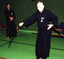 Ganmenate: atemi is somewhat above the point between the eyes (?) One should keep looking until the opponent drops. Sayabiki by turning the hips, the mune must remain in contact with the body. Tsuki to the suigetsu, so the extension of the tsuka would just touch the body (the right hand not too far in or out). Raising the sword and cutting with the tip moving in a vertical plane.