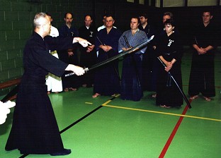 Morotetsuki: the nukitsuki here should also be a flick of the wrist instead of a real cut (it was observed that Oda didn't bend his wrist anything near as much as Furiuchi in the few moves he demonstrated). In the chudan position, the left foot must remain behind the right. During the stab the arms are extended farther than we were used too (there is even some bending forward). Raising the sword while turning should be done close to the body and with the tip moving in a vertical plane. Apparently we are to step first and cut later, rather than at the same time.