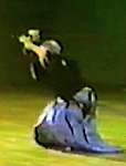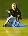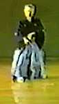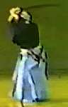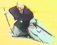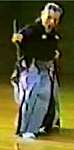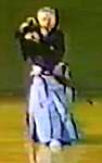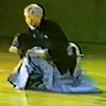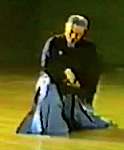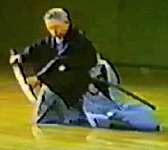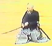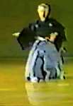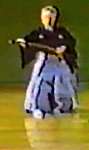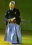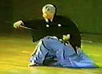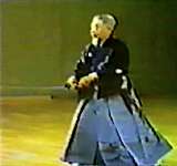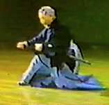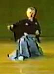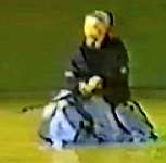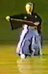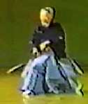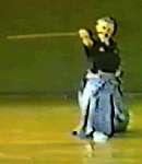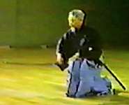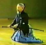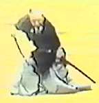 Teki attacks with a cut to the head. Draw upward in uke nagashi (45°) while sitting up on the knees and moving the right knee back slightly to hanmi, then advance the right foot and cut onehanded to teki's right men. Then rise while keeping the sword horizontal and pointing to the right, with the feeling of pushing teki away with your right fist. Advance with the left foot and assume tsuki position (without moving back the right hand). Tsuki position is with left foot forward, right hand close to the right eye, edge pointing up, mune resting on the left fist between thumb and index. The left arm is extended horizontally as far as possible. The feet must remain parallel.