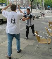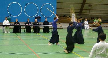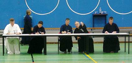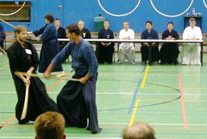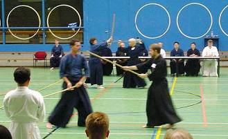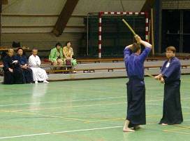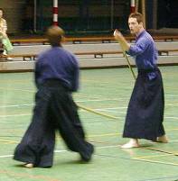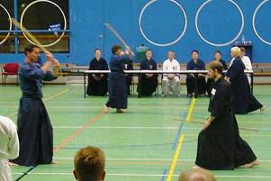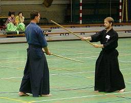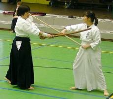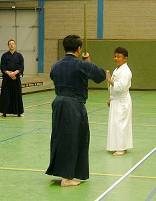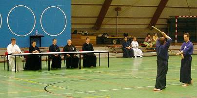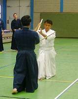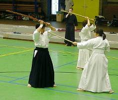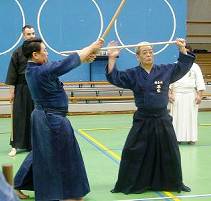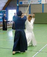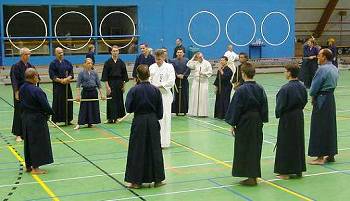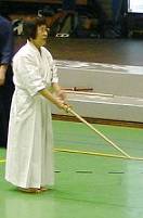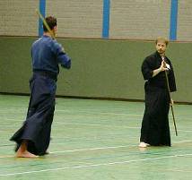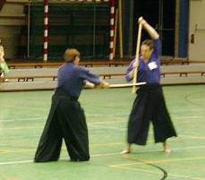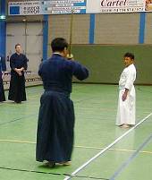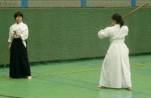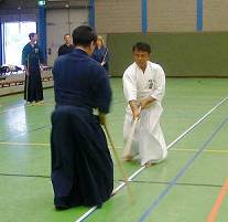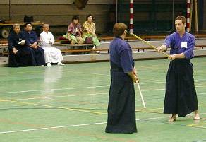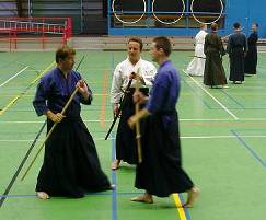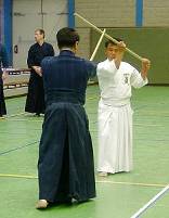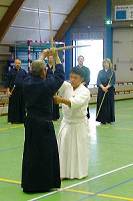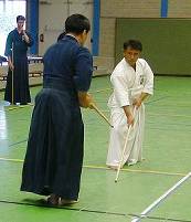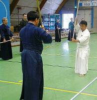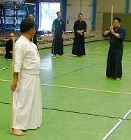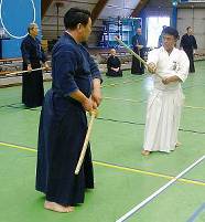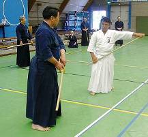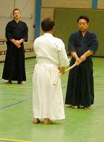 Considerable emphasis was placed on correct dress. It was explained that the cross-like hakama knot is no longer accepted in Jodo, because it is not a "samurai musubi" but a way of making the knot developed by commoners. From now on a flat knot with the ends tucked in at the side splits is required. (for the moment this rule does not yet extend to Iaido).