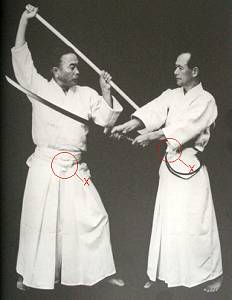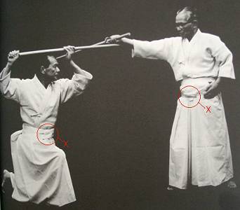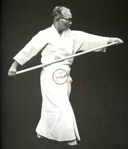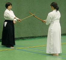 There is also a change in the procedure for exchanging weapons (shi uchi kotai). After accepting the tachi, uchidachi carries it with the arm straight. Both turn right (clockwise), and the jo is NOT pointed at the floor during the turn, but kept in tsune no kamae.
